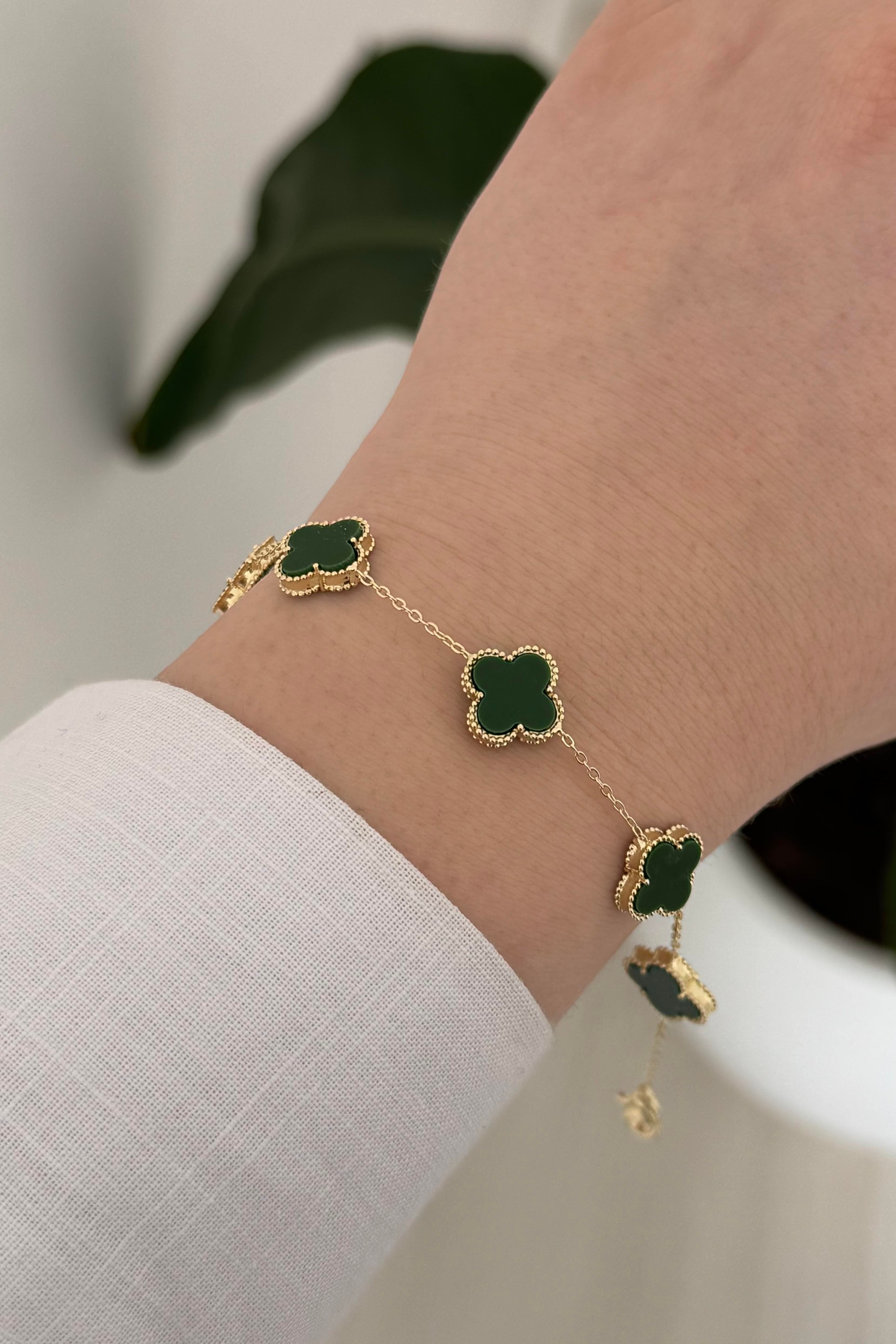 Materyali yüksek kalite pirinç üzeri 14k altın kaplamadır. Üzerinde ki taşlar zirkondur. Ürün uzunluğu yaklaşık 17-22 cm'dir. Alerji testinden başarı ile geçtiği için hassas ciltler için de uygundur.Uzun süreli kullanım ve parlaklığını kaybetmemesi için parfüm, deterjan gibi kimyasallarla temas etmemesi önerilir.
